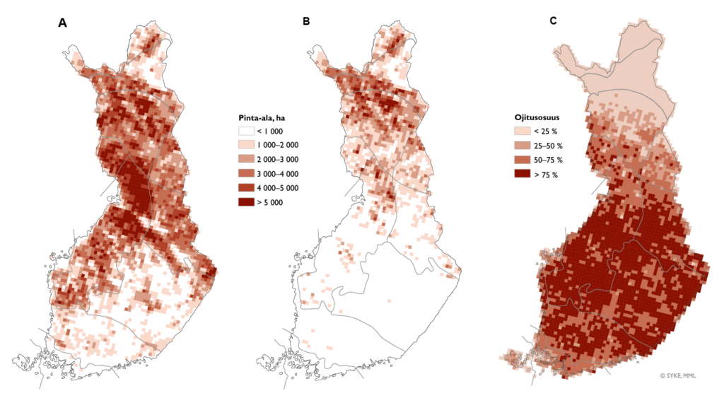 Kuva 3. Suomen kaikkien (A) ja ojittamattomien (B) turvemaiden pinta-ala sekä ojitettujen turvemaiden osuus kaikista turvemaista (C) 10 km × 10 km ruudukossa. Kuvat: Kaakinen ym. 2018.